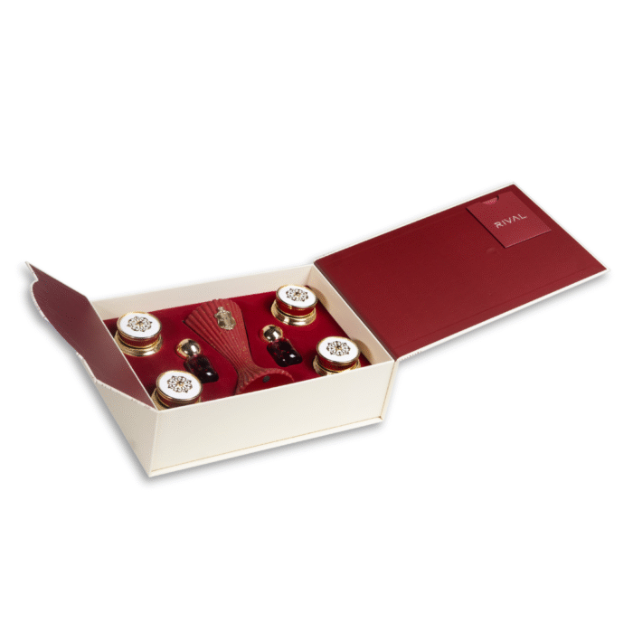 تضم المجموعة أربع عبوات بخور فاخرة بأغطية ذهبية مزخرفة، ومبخرة عصرية أنيقة، وعطر مسك للاستخدام الشخصي، بالإضافة إلى عطر مخصص للشعر، جميعها مرتبة داخل بطانة مخملية حمراء فاخرة تضيف لمسة من الفخامة والرقي.