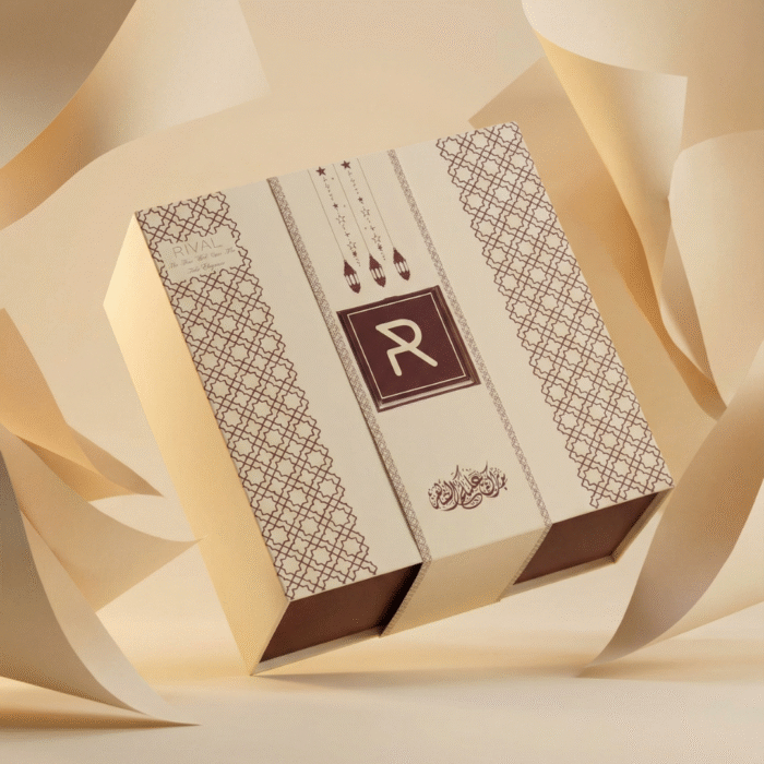 • علبة تقديم فاخرة باللونين الكريمي والعنابي تحمل علامة RIVAL