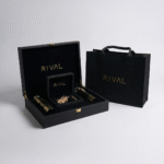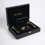 صندوق خشبي فاخر باللون الأسود مع شعار RIVAL الذهبي وتجهيزات ذهبية